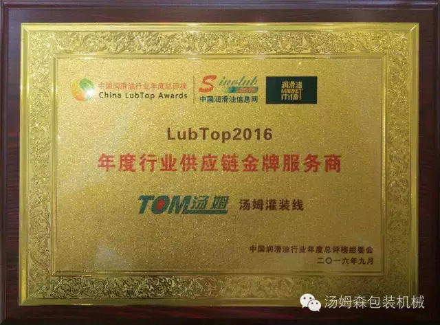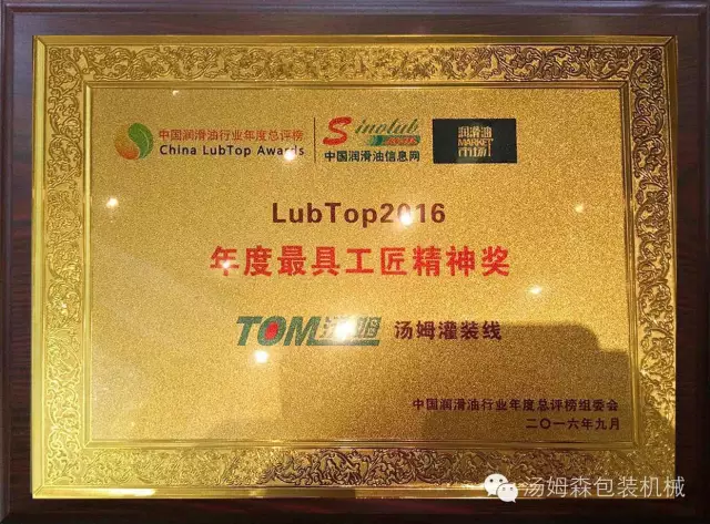 2016919日,在花城廣州舉辦的“LubTop2016中國潤滑油行業年度總評榜頒獎盛典上,江蘇湯姆集團的設備贏得了社會公眾和專家評委的廣泛認可,終榮獲“ LubTop2016年度行業供應鏈金牌服務商”和“LubTop2016 年度具工匠精神獎兩項殊榮,湯姆集團董事長湯建華出席了頒獎盛典。這是整個潤滑油行業對湯姆集團的高度認可。